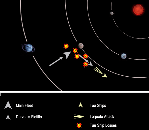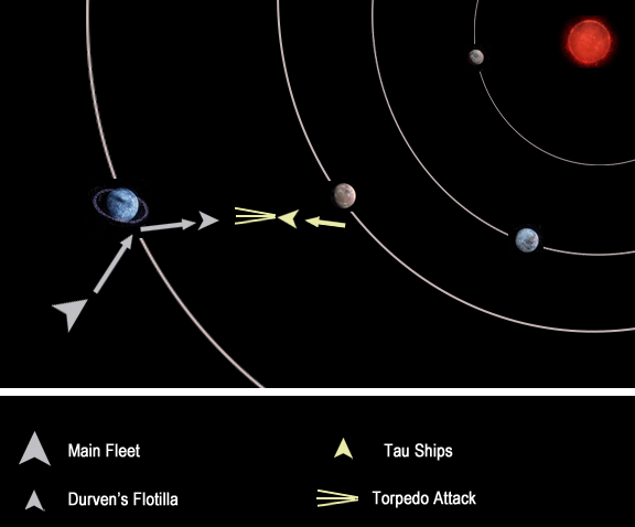 Undeterred by a force of equivalent size, Durven ordered an immediate attack. The Tau responded in kind, accelerating aggressively toward the Imperial flotilla.