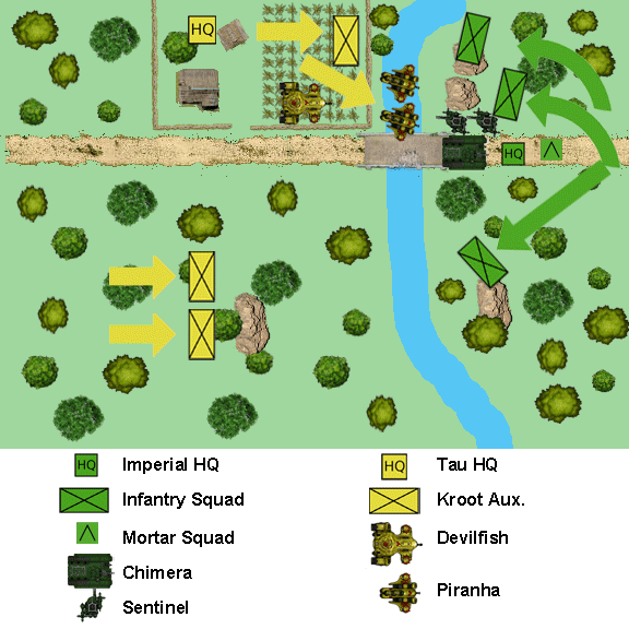 By my thinking, the Kroot almost certainly would seek to turn my left flank, using the dense forest to minimize incoming fire as they moved into charge range of my troops. If I stayed on the defensive, the Tau could pin down my main force with a demonstration while the Kroot defeated my flanking force—and then get behind me.