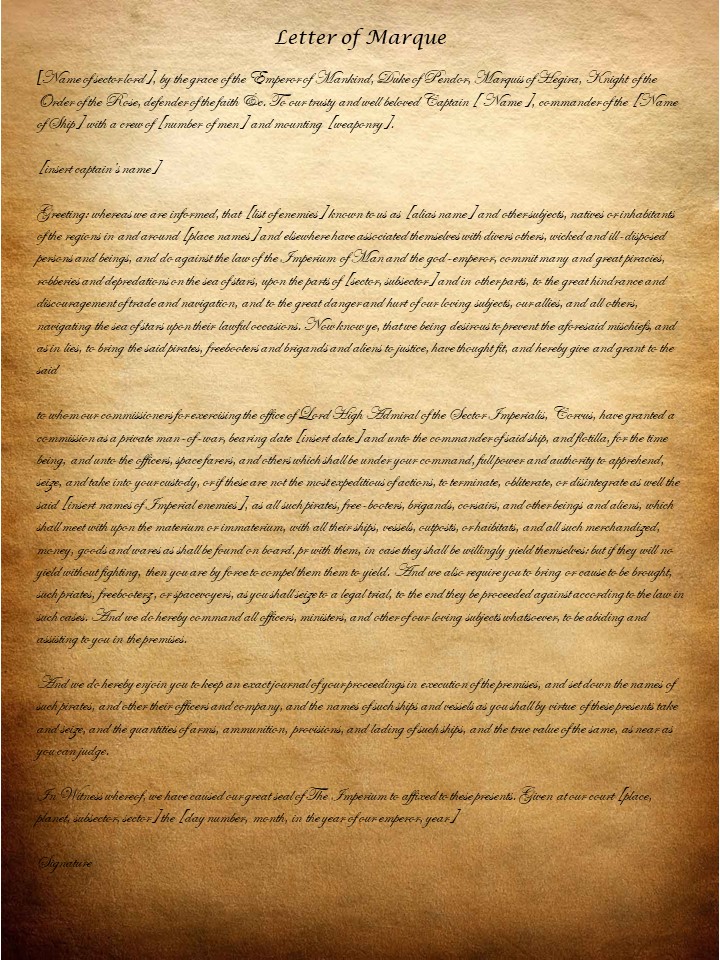 [Insert captain’s name] Greeting: whereas we are informed, that [list of enemies] known to us as [alias name] and other subjects, natives or inhabitants of the regions in and around [place names] and elsewhere have associated themselves with divers others, wicked and ill-disposed persons and beings, and do against the law of the Imperium of Man and the god-emperor, commit many and great piracies, robberies and depredations on the sea of stars, upon the parts of [sector, subsector] and in other parts, to the great hindrance and discouragement of trade and navigation, and to the great danger and hurt of our loving subjects, our allies, and all others, navigating the sea of stars upon their lawful occasions. Now know ye, that we being desirous to prevent the aforesaid mischiefs, and as in lies, to bring the said pirates, freebooters and brigands and aliens to justice, have thought fit, and hereby give and grant to the said [Insert captain’s name] to whom our commissioners for exercising the office of Lord High Admiral of the Sector Imperialis, Corvus, have granted a commission as a private man-of-war, bearing date [insert date] and unto the commander of said ship, and flotilla, for the time being, and unto the officers, space farers, and others which shall be under your command, full power and authority to apprehend, seize, and take into your custody, or if these are not the most expeditious of actions, to terminate, obliterate, or disintegrate as well the said [insert names of Imperial enemies], as all such pirates, freebooterz, brigands, corsairs, and other beings and aliens, which shall meet with upon the materium or immaterium, with all their ships, vessels, outposts, or habitats, and all such merchandized, money, goods and wares as shall be found on board, or with them, in case they shall be willingly yield themselves; but if they will no yield without fighting, then you are by force to compel them to yield. And we also require you to bring or cause to be brought, such pirates, freebooterz , or space voyagers, as you shall seize to a legal trial, to the end they be proceeded against according to the law in such cases. And we do hereby command all officers, ministers, and other of our loving subjects whatsoever, to be abiding and assisting to you in the premises.