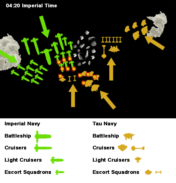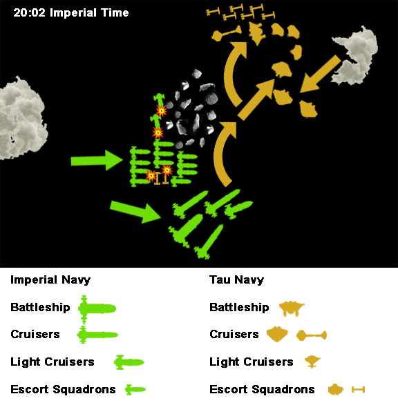 Unable to get behind the Imperial task force, the Tau commander ordered his ships to turn sharply to starboard. The fleet becomes hopelessly disorganized.