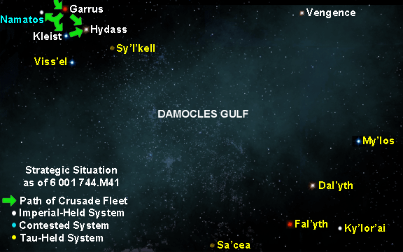 Little more information was provided by the astropathic messages, Wythe said. Although there are no inhabited worlds in the Hydass System, there are believed to be several Tau-infested worlds remaining on this side of the Damocles Gulf, and it is expected the Crusade Fleet will deal with them before beginning the treacherous crossing of the Damocles Gulf.