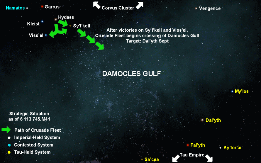 The most exciting news from Admiral Jallaque, however, was that, after largely eliminating the xeno presence on this side of the Damocles Gulf, the Crusade Fleet finally launched itself on a five-month-long journey across the Damocles Gulf.