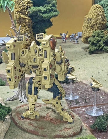 In the center, she placed a Riptide, positioned in some ruins that allowed the giant walker to support either flank as needed.