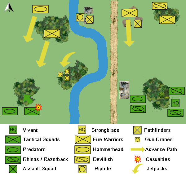 Concerned by the maneuverability of Tau aerial troops, Vivant adopted a conservative stance for his deployment. Most of his troops and armored assets were positioned on the east flank, grouped tightly together to defend against aerial drops to the flanks.