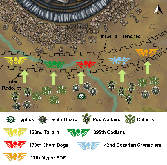 The battle was broken into two wings, separated by the sludge-filled Sordes River. To the east of the river, at least 40 regimental-sized warbands of cultists and an uncertain number of Traitoris Militarum regiments advanced across a barren, crater-pockmarked landscape.