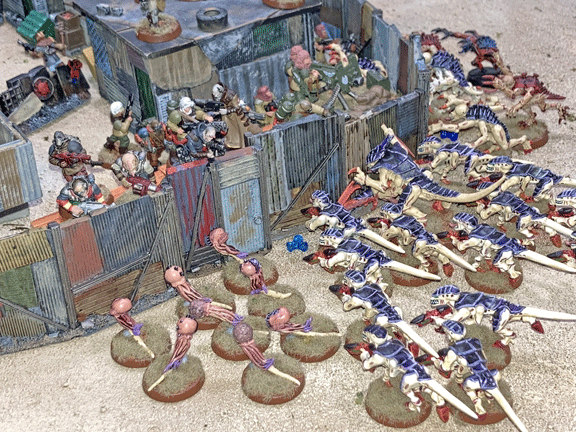 Every autogun and a handful of lasguns opened up on the xenos, adding their fire to that of the heavy bolters. The xenos began to fall in even greater numbers, their bodies slamming hard to the ground and then being trampled by the xenos behind them that rushed forward to fill the gaps.
