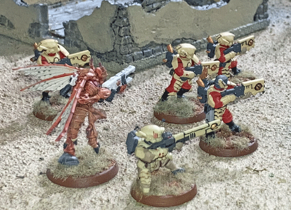 As Imperial soldiers dealt with this threat, however, the distraction allowed several Fire Warriors to advance with minimal risk, and the squad’s flank was threatened with being overwhelmed by numbers.