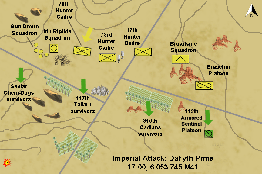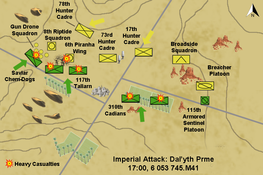 As the sun set, none of the three Imperial regiments were functioning units. Overall casualties exceeded 50 percent, and the 310th Cadians were reduced to a few hundred men out of an original 2,000.