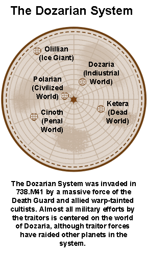 An ultra-fast reconnaissance ship, sent by the Imperial Navy to make a quick run of the system and depart, has confirmed those fears. Although the vast Imperial army on Dozaria continues to hold out against the traitor forces, some traitor warbands have taken the opportunity to wreak havoc across the system.