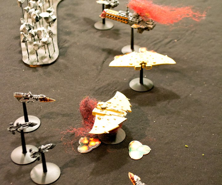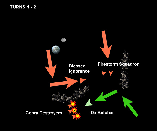 1100-1200 (TURN 5) At this point of the battle, both fleets were firing at point-blank range–with weapons batteries, lances, railgun batteries,  ion cannons, and torpedoes blazing away. Not suited to close-in fighting, The Emperor’s Fist, launched another wave of Starhawk bombers and then turned to starboard to avoid […]